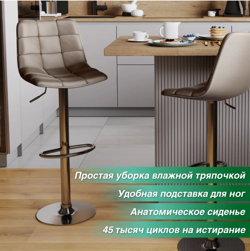 Барный стул оснащен подъемно-поворотным механизмом типа газлифт. Благодаря этому, стул подойдет к любой барной стойке и будет удобен любому — ведь высоту сиденья легко отрегулировать. Барный стул вращается на 360 градусов. Хромированная опора не боится царапин и придаёт стулу изысканный стиль. Основание снабжено нескользящей резиновой накладкой, что делает передвижения стула бесшумными и не оставляет следов на половом покрытии. Стул имеет удобную опору для ног.