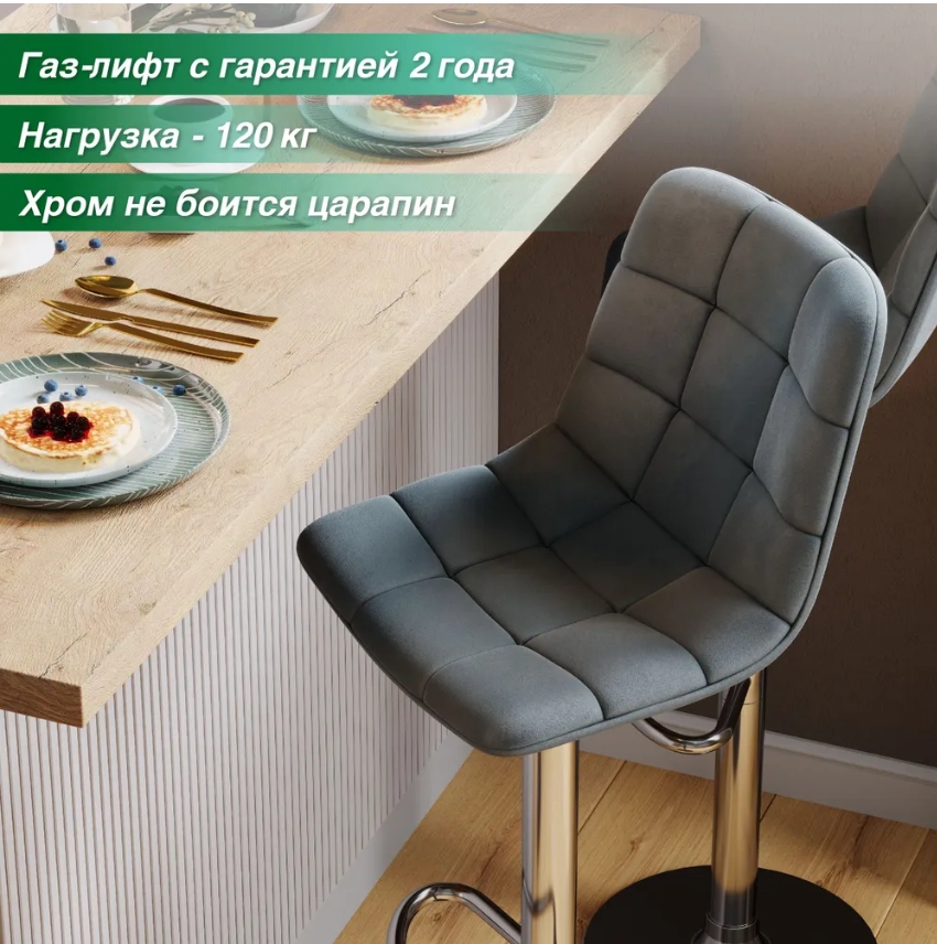 Барный стул оснащен подъемно-поворотным механизмом типа газлифт. Благодаря этому, стул подойдет к любой барной стойке и будет удобен любому — ведь высоту сиденья легко отрегулировать. Барный стул вращается на 360 градусов. Хромированная опора не боится царапин и придаёт стулу изысканный стиль. Основание снабжено нескользящей резиновой накладкой, что делает передвижения стула бесшумными и не оставляет следов на половом покрытии. Стул имеет удобную опору для ног.